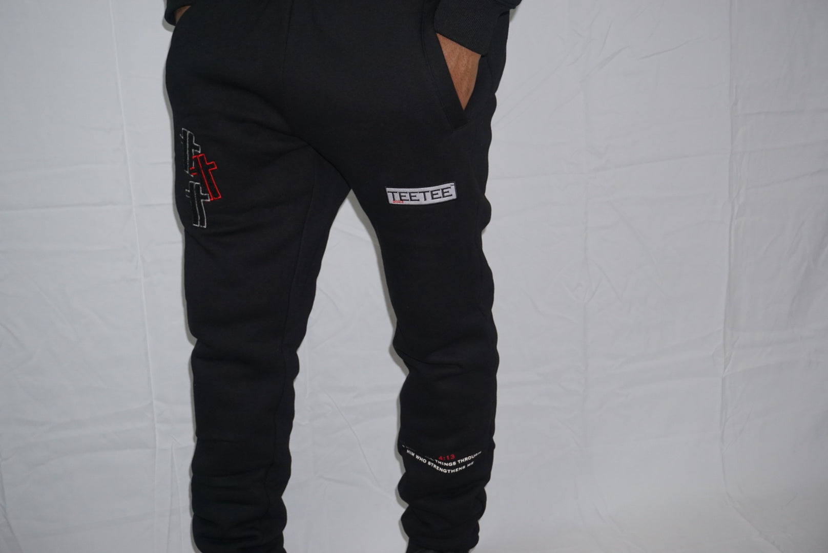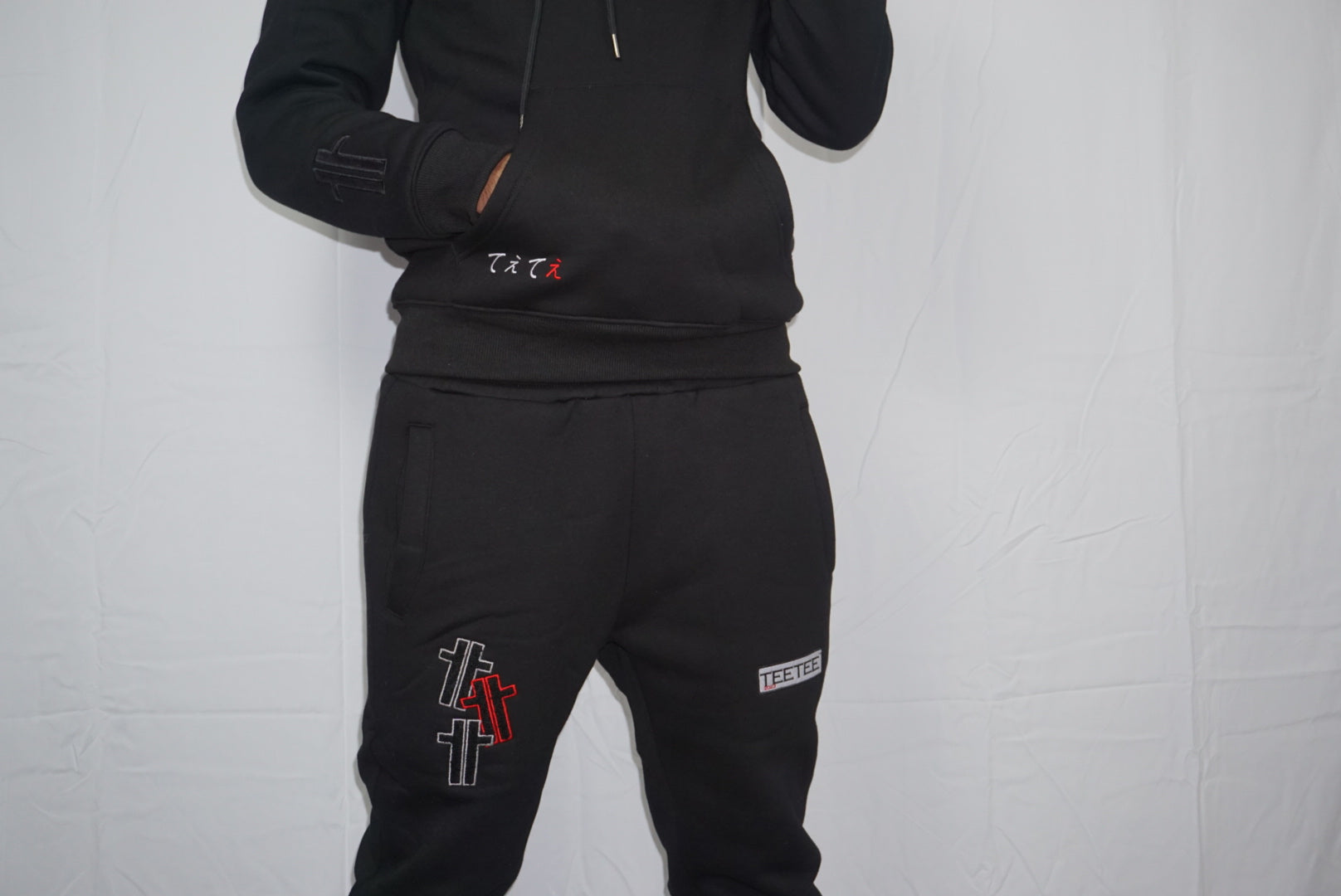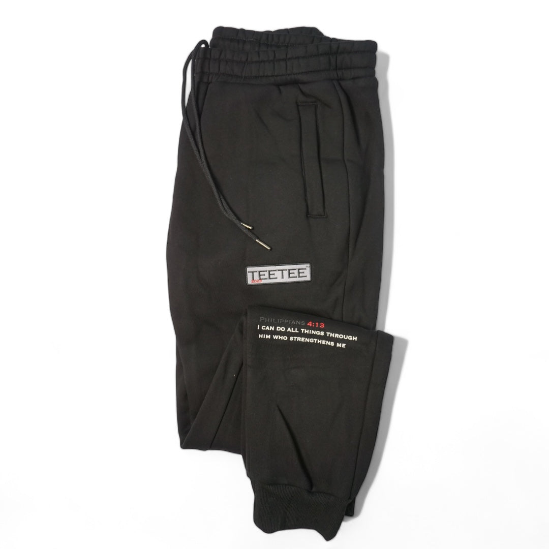 Teetee Chenille Bottoms in Black with Red trimmings. Crafted from soft, comfortable and fabric that is perfect for everyday casual wear. These premium style bottoms come featured with stretchy ribbed waist trims and cuffs to secure the fit. Equipped with metal tipped drawstrings and eye catching Triple T Teetee logo on the side .